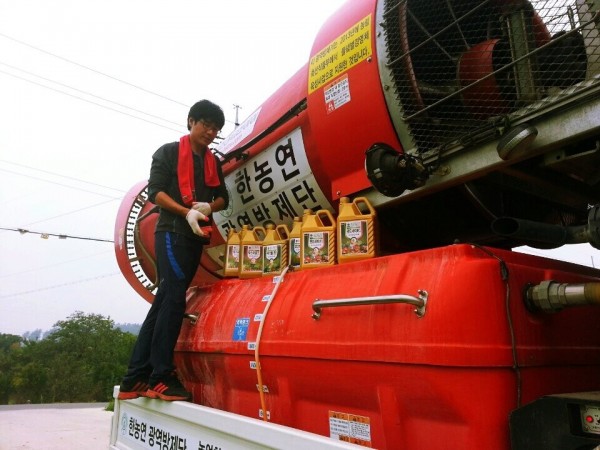 광역방제의 경우 위의 4가지 농자재를 3000리터 통에 투입하여 사용하므로 작업의 효율성을 고려해 업계 최초로 4리터 대용량제품으로 출시하여 공급하였다.